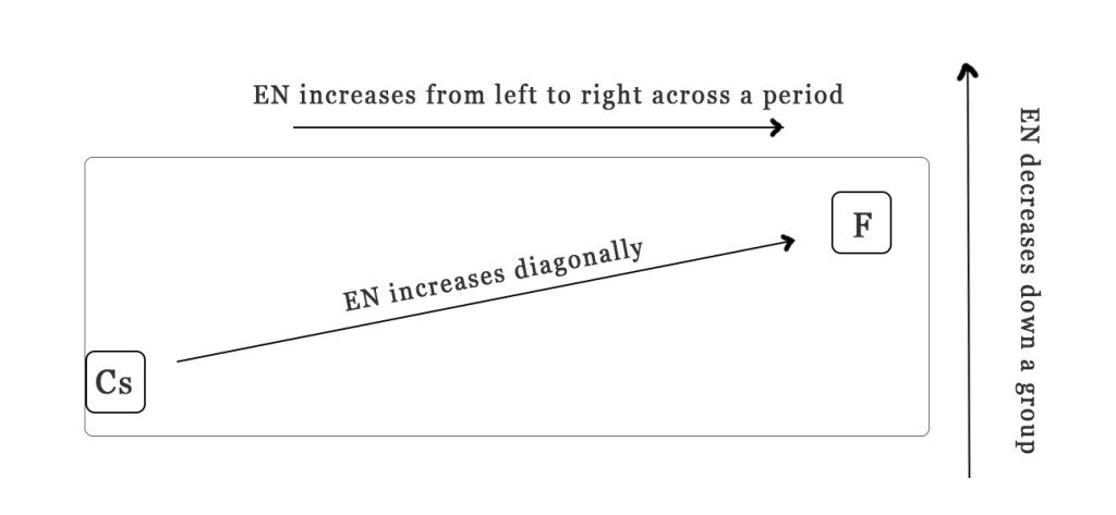 (NoteWhile remembering the periodic trend in EN, keep the above figure in mind. Fluorine has the highest EN value, so all arrows increase towards F and cesium has the lowest EN value, so all arrows decrease towards it).