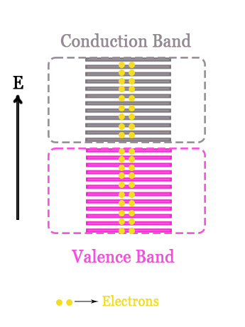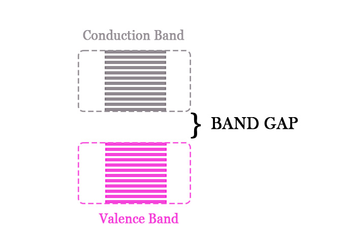 This band gap determines whether a material is a conductor, semi-conductor, or an insulator. If the band gap is too high, the material is an insulator. This is because the electrons in the valence band cannot easily move up to the conduction band. In semiconductors, this gap is a little less. In metals, however, there is no band gap. The valence and the conduction band are very close to each other and sometimes overlap too. With the application of a little potential difference, the electrons from the valence band can easily go to the conduction band and roam there. This is why metals are good conductors of electricity.