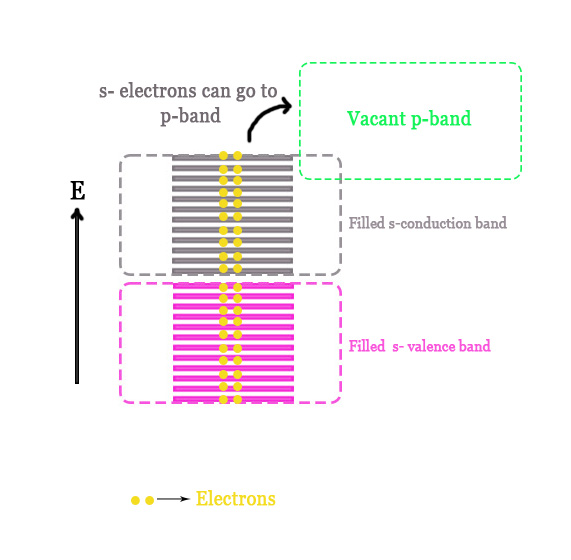 In this case, however, there are vacant p-orbitals (4p in the case of Mn) that form the p- band. The lower end of this vacant p-band lies a little lower in energy than the topmost end of the s-band (as shown in the figure below). Thus, electrons can be promoted to this p-band easily with the application of little potential difference. Thus, the band theory of solids helps explain why metals are good conductors of electricity.