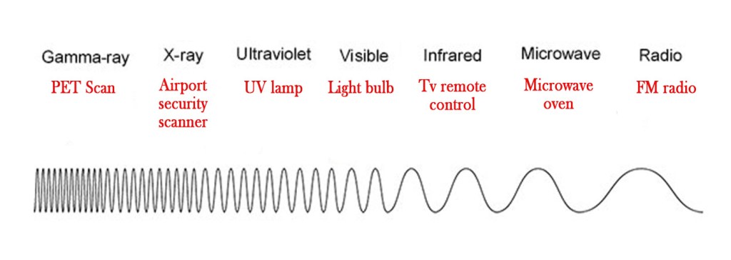 The light that we see is just part of the electromagnetic radiation spectrum.This spectrum has waves with different wavelengths.The electromagnetic spectrum can be shown as below –