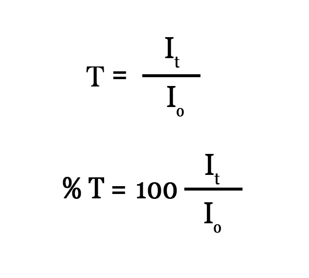 The transmittance (T) is the ratio of the intensity of the transmitted light to the intensity of the incident light. As this is a ratio, it does not have any units. Transmittance takes values between 0 and 1 but usually transmittance is expressed as %T (percentage transmittance) –