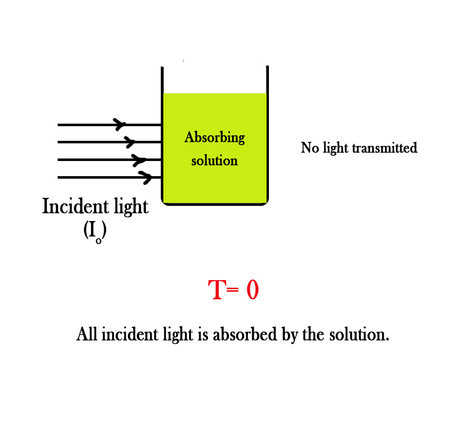 Thus, if a solution absorbs all the light incident upon it (100%) then ,no light will be transmitted (0% T). Correspondingly, if the solution does not absorb any light then it will transmit all the incident light. Thus, the absorbance will be 0% and transmittance 100% .